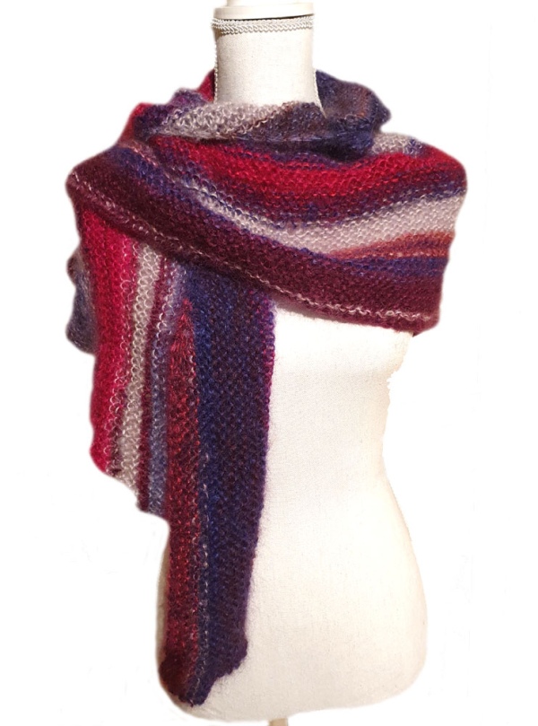 | Pièces uniques | Châle à bande fantaisie, Châle mohair bleu, Chauffe épaules camaïeu de violets, chauffe épaules dégradé de roses, Chauffe épaules cape, Chauffe épaules möbius, Chèche camaïeu de bleus, Châle queue de dragon dégradé de roses |